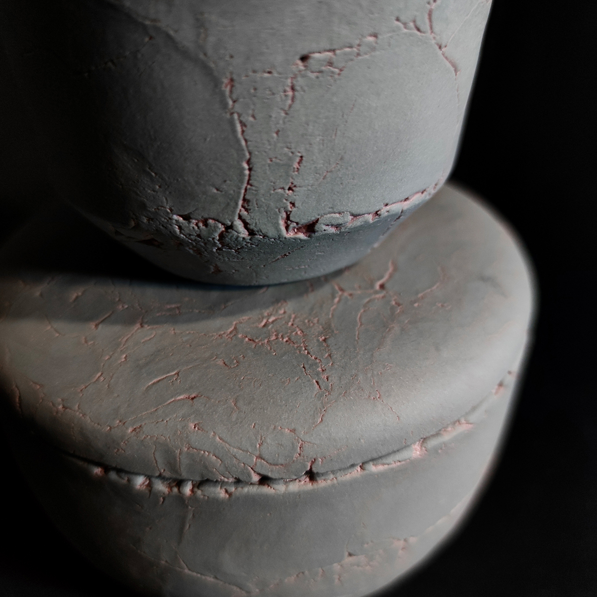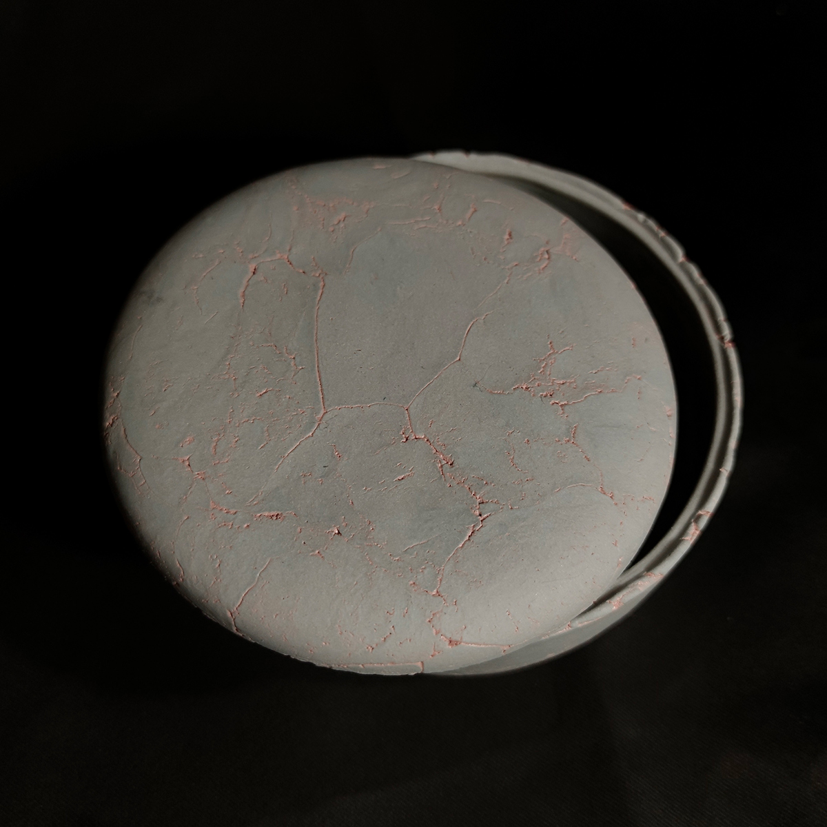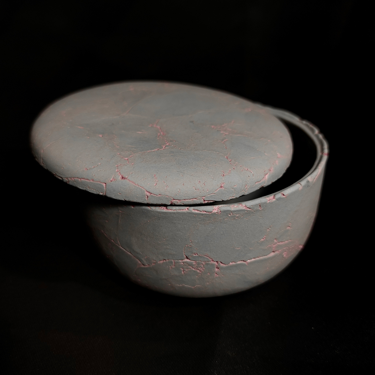 Handmade ceramic lidded jar crafted from grey-pigmented earthenware with a soft light-pink marble effect. Perfect for hiding small treasures or snacks.